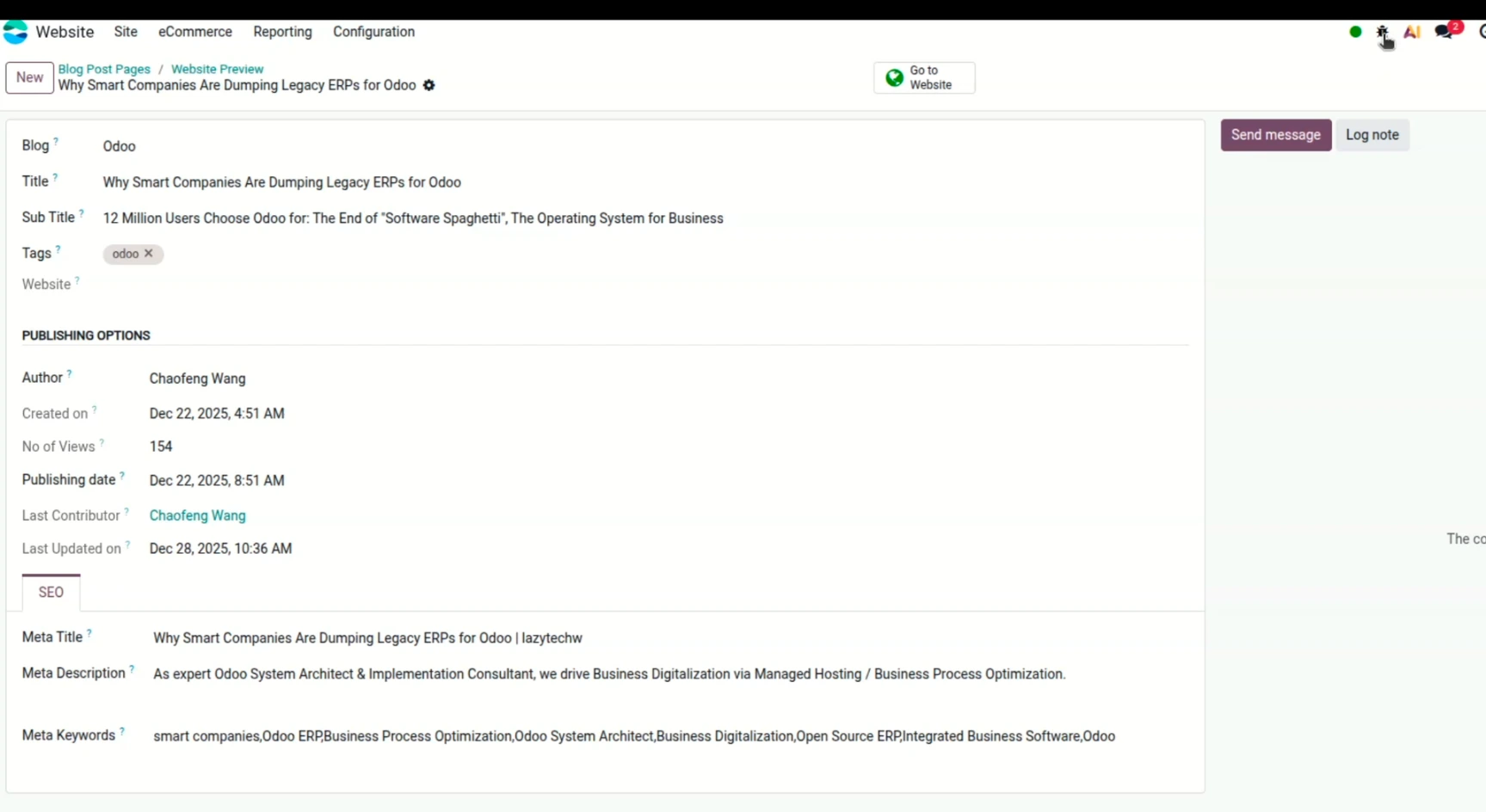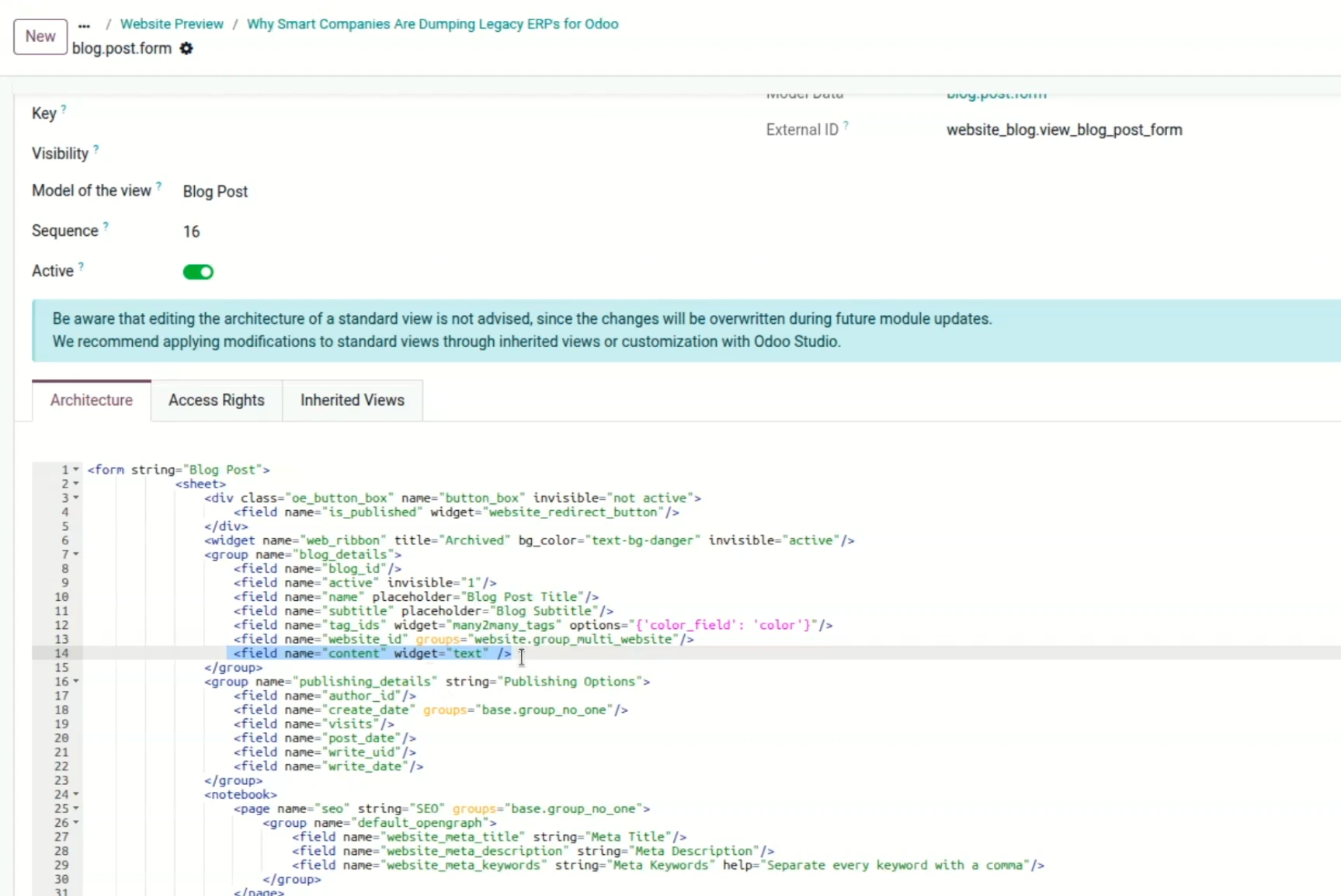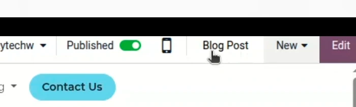 4. Here is the Blog post form view (see below). Now click the "bug" button on the top right (look, there is a mouse hand).